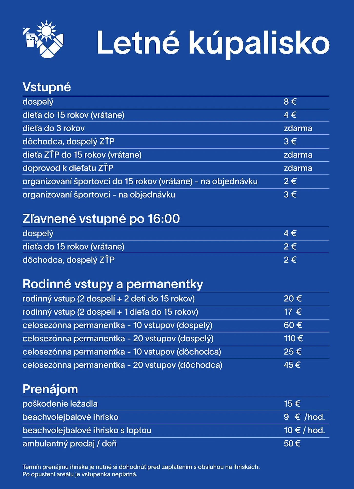 Lacnejšie vstupné na kúpalisko bude tak ako v minulosti po 16. hodine. Kompletný cenník nájdete aj na konci článku.