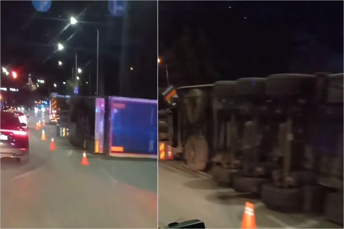 VIDEO: Na frekventovanej križovatke v Nitre sa večer prevrátil kamión, zasahovali hasiči aj polícia