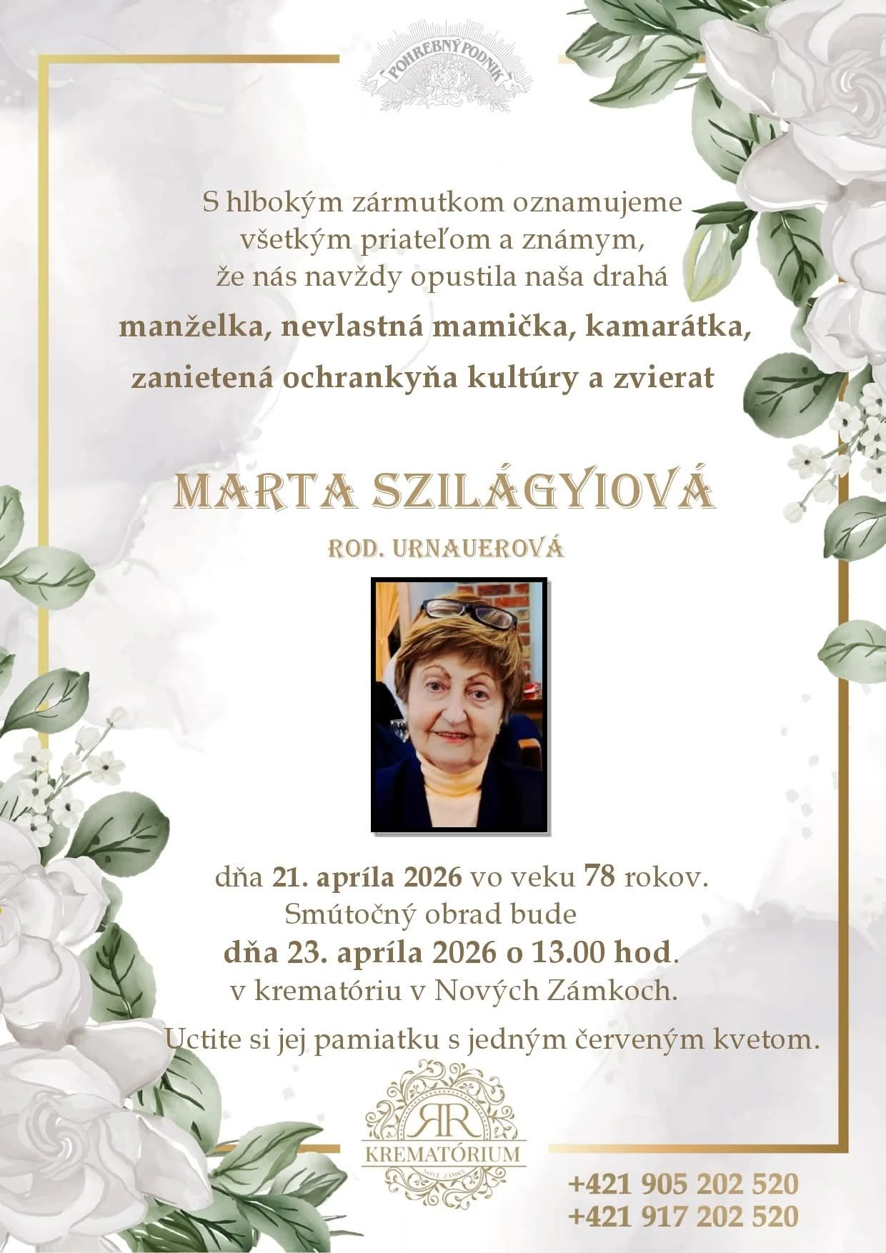 Posledná rozlúčka s pani Martou sa uskutoční vo štvrtok 23. apríla o 13:00 hodine v krematóriu v Nových Zámkoch. Smútiaca rodina zároveň vyzvala verejnosť, aby si jej pamiatku uctila symbolicky: „Uctite si jej pamiatku jedným červeným kvetom.“