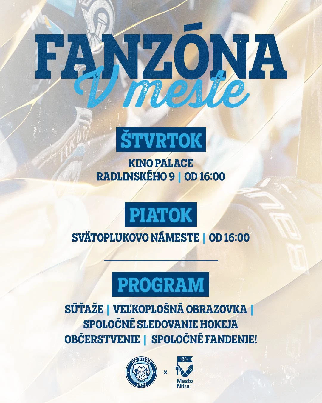 Miestni fanúšikovia ale nemusia zúfať. Pravú hokejovú vášeň si budú môcť vychutnať vo fanzónach. Pripravilo ich Mesto Nitra spolu s HK Nitra, aby si nadšenci hokeja mohli spoločne vychutnať vonkajšie play-off zápasy v jedinečnej atmosfére.