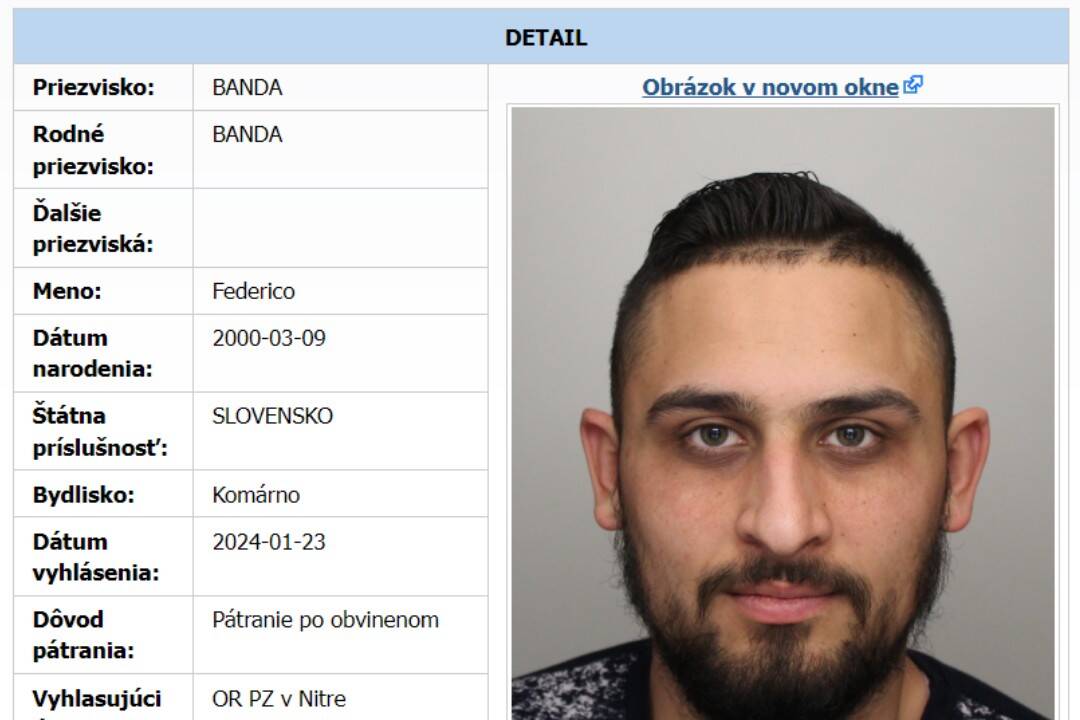 Okresné riaditeľstvo Policajného zboru v Nitre vyhlásilo ešte 23. januára 2024 pátranie po obvinenom mužovi z Komárna. 24-ročný Federico Banda má čierne vlasy, bradu a fúzy, tmavozelené oči a tmavšiu pleť.