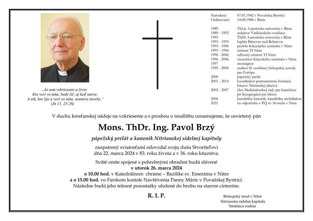 Vo veku 83 rokov zomrel Pavol Brzý. Bol kanonikom Nitrianskej sídelnej kapituly a pápežský prelát