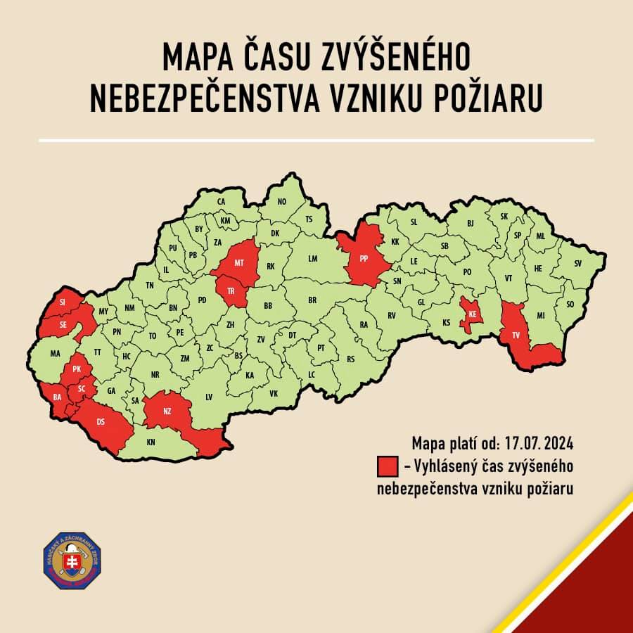 V stredu 17. júla na mape dokonca pribudol aj jeden okres patriaci pod Nitriansky kraj, a to Nové Zámky. Čas zvýšeného nebezpečenstva vzniku požiaru vyhlasujú okresné riaditeľstvá Hasičského a záchranného zboru buď pre celý okres, alebo len pre jeho určitú časť. K vyhláseniu pristúpia po tom, čo suché a teplé počasie trvá najmenej päť po sebe nasledujúcich dní alebo po tom, čo sa v priebehu troch dní zvýšil počet požiarov lesa či trávnatých porastov.