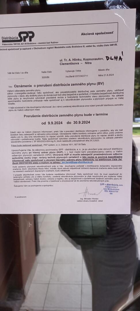 Obyvateľov niektorých ulíc na Chrenovej v Nitre prekvapil oznam od distribútora plynu SPP. Informoval v ňom o plánovanej odstávke z dôvodu vykonania pravidelnej revízie plynovodu. Zopár ľudí však zaskočil fakt, že odstávka na uliciach Trieda Andreja Hlinku, Kozmonautov a Clementisova má potrvať celé tri týždne - od 9. do 30. septembra.