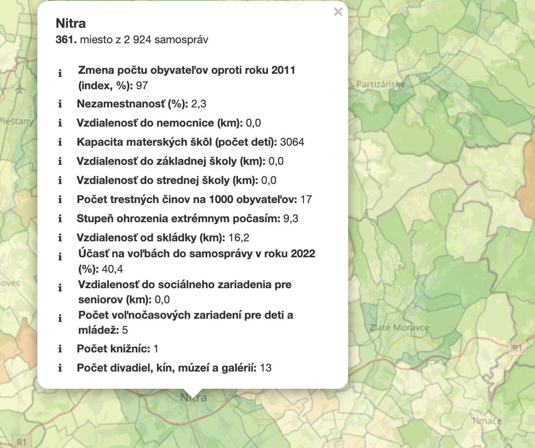 Z okresných miest sa najlepšie umiestnila krajská Nitra na 361. mieste. Inak vysoké hodnotenie vďaka dostatku predškolských a voľnočasových zariadení, dostupnosti lekárskej starostlivosti, divadiel, kín či múzeí mierne znižuje veľké riziko extrémnych prejavov počasia, ale aj vyššia miera kriminality – kým v Svätoplukove štatistika hovorí o 7 trestných činoch na 1000 obyvateľov, v Nitre je to 17.