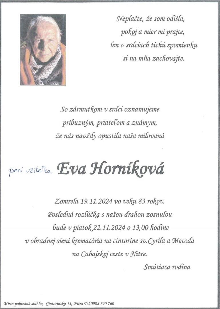 Smútiaca rodina s ľútosťou informovala o úmrtí Evy Horníkovej z Nitry. Za života dlhé roky pôsobila ako učiteľka na základnej škole v Janíkovciach. Okrem príbuzných a priateľov na ňu s láskou spomína množstvo niekdajších žiakov a kolegov.