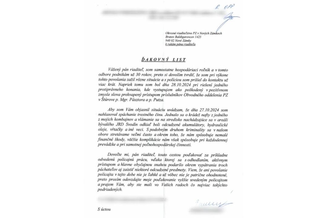 Policajtom zo Štúrova sa na prelome októbra a novembra podarilo objasniť prípad krádeže na poľnohospodárskom družstve. Od poškodeného, pána Arnolda, im neskôr prišlo krásne poďakovanie. Verejnú pochvalu si vyslúžili aj od svojich nadriadených a kolegov, ktorí zverejnili ďakovný list na sociálnej sieti polície.