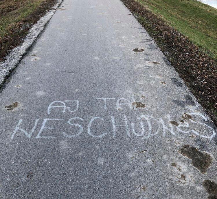 Na chodníku bolo veľkými bielymi písmenami nasprejované: „Aj tak neschudneš“. Tieto slová asi ľudí, ktorí si dali v novom roku predsavzatie začať športovať a dostať sa do formy, nepotešia, no tých so zmyslom pre humor určite dobre pobavia.