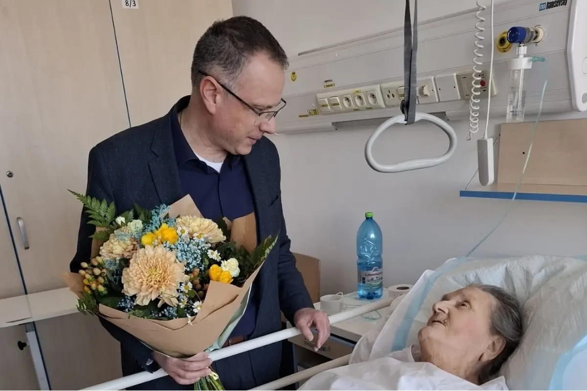 Obyvateľke Mojmíroviec v tento špeciálny deň prišili osobne zagratulovať riaditeľ nemocnice Ondrej Šedivý, námestník pre ošetrovateľskú starostlivosť Peter Zito a prednosta kliniky Ivan Vaňo.