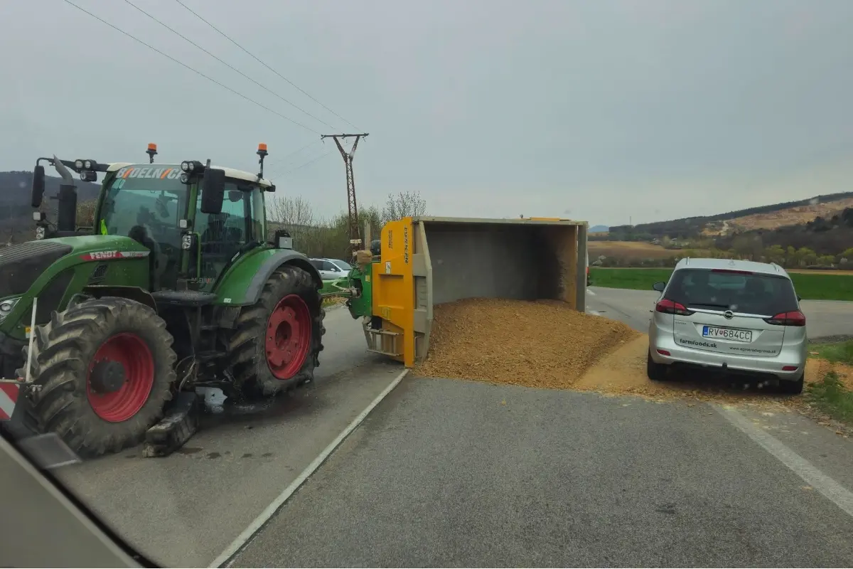 Na Zlatomoravckej ceste za Nitrou sa prevrátil príves traktora, vysypala sa z neho zemina. Úsek bol ťažko prejazdný