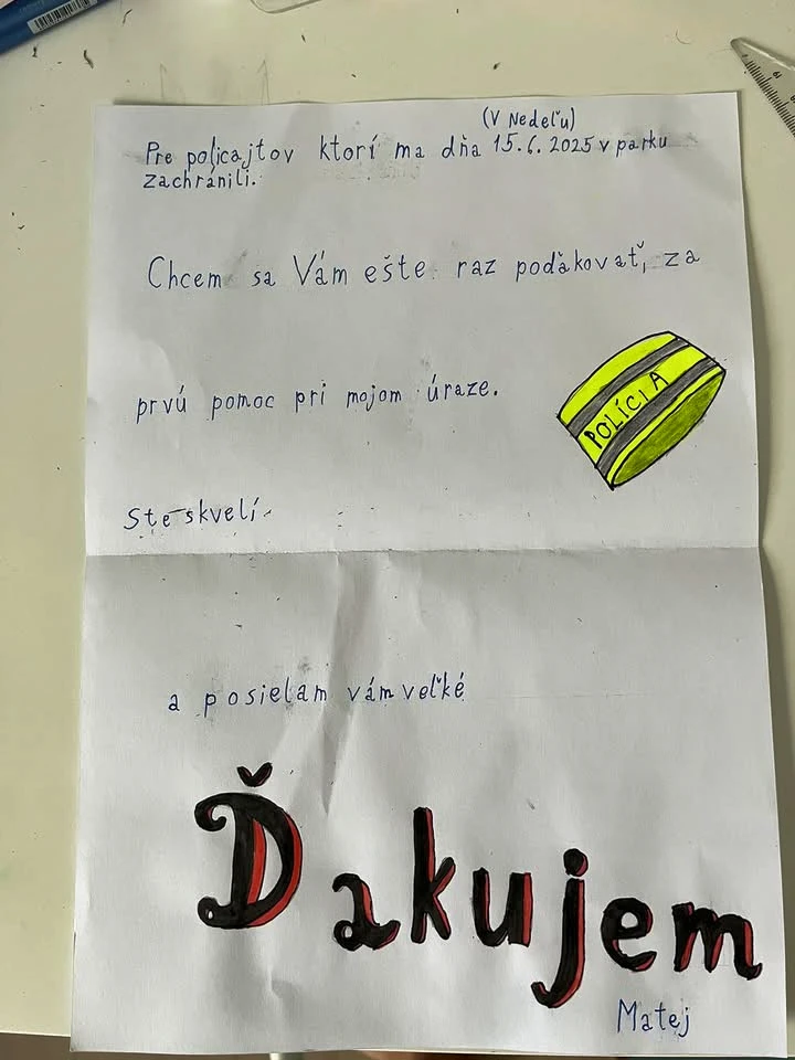 O niekoľko dní krajská polícia dostala súkromnú správu od maloletého Mateja. „Pre policajtov, ktorí ma dňa 15. 6. 2025 (v nedeľu) v parku zachránili. Chcem sa Vám ešte raz poďakovať za prvú pomoc pri mojom úraze. Ste skvelí. A posielam vám veľké Ďakujem,“ poďakoval sa im, pričom vo svojom ďakovnom liste zanechal aj menší obrázok symbolizujúci políciu.