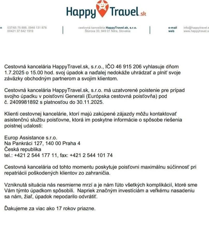 Šok pre stovky slovenských dovolenkárov. Cestovná kancelária HappyTravel.sk so sídlom v Nitre po 17 rokoch na trhu nečakane oznámila krach. Slováci zostali bez dovoleniek – niektorí doma, no iní priamo uväznení v zahraničí.