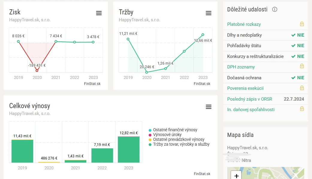 Podľa údajov z Finstatu HappyTravel v roku 2023 zvýšila svoj zisk o 23 % na 3 478 eur a jej tržby narástli o 79 % na 12,6 miliónov eur. Na trhu pôsobila 12 rokov. Údaje za minulý rok zatiaľ dostupné nie sú, no v roku 2023 nemala spoločnosť ani žiadne nedoplatky či dlhy na daniach.