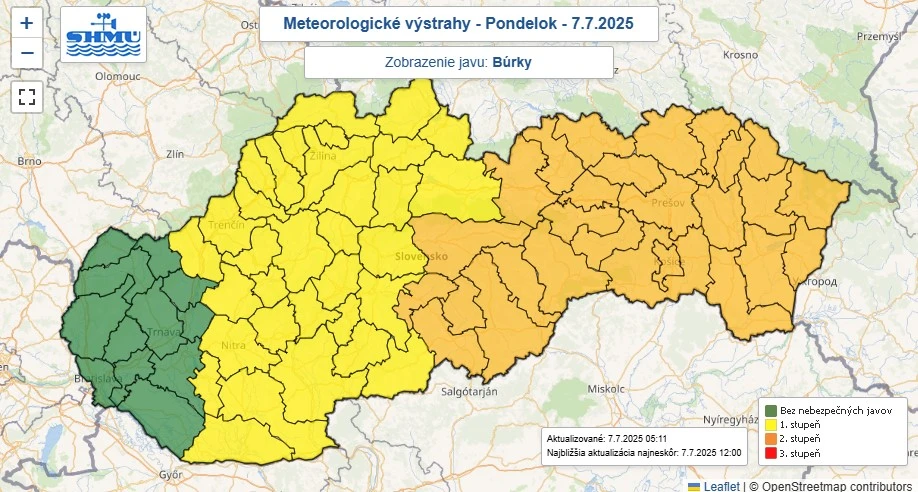 Pre všetky okresy Nitrianskeho kraja sú od 17:00 do 18:00 hod. vyhlásené výstrahy 1. stupňa. Očakáva sa i prudký lejak s intenzitou 20 až 30 milimetrov za 30 minút, krúpy a nárazy vetra s rýchlosťou 65 až 85 km/h. Žlté je celé stredné Slovensko a oranžová je východná časť krajiny, kde platí 2. stupeň. Očakáva sa tam aj viac zrážok a silnejší vietor.