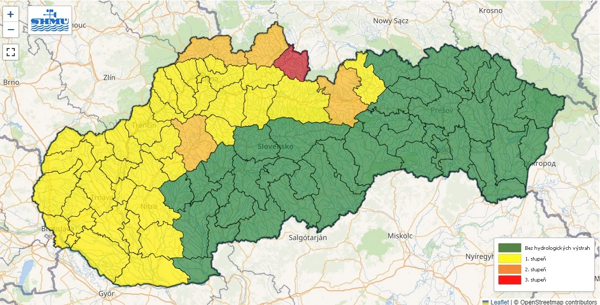 Na západe by však mal dážď pomaly ustávať. Výstrahy pred zrážkami sú stále v platnosti, no v iných častiach Slovenka. 1. stupeň platí pre niektoré okresy Trnavského a Banskobystrického kraja, 2. stupeň pre Trenčiansky kraj. Najhoršia situácia má byť v okresoch Prešovského a Žilinského kraja, kde je vyhlásený 3. stupeň.