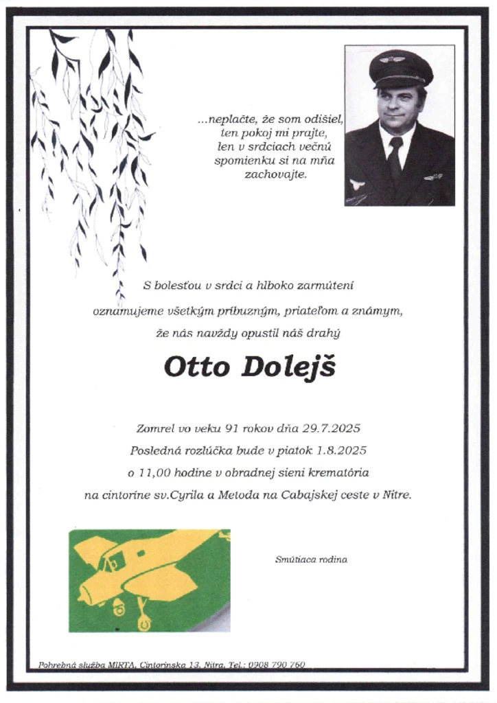 Vo veku 91 rokov zomrel známy slovenský akrobatický pilot Otto Dolejš, rodák z Nitry, ktorého meno rezonuje najmä s ranými etapami športového lietania na Slovensku. V roku 1959 sa zúčastnil prvých majstrovstvách Slovenska v leteckej akrobacii a vyhral druhé miesto.