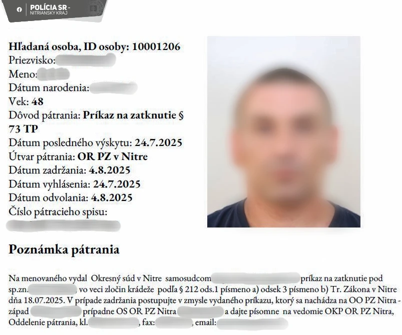 „Na miesto zakrátko prišla hliadka obvodného oddelenia, ktorá si muža prevzala. Lustráciou bolo potvrdené, že na muža je vydaný zatykač pre zločin krádeže, za ktorý si má odpykať 4 roky väzenia,“ informovala nitrianska krajská polícia.