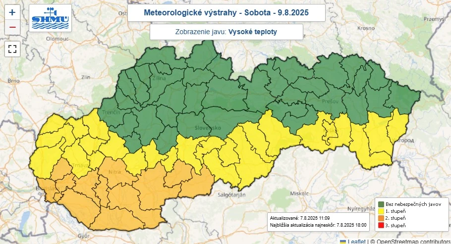 Upozornenie začne platiť od 14:00 hod. a potrvá do 18:00 hod. V okrese Topoľčany a Zlaté Moravce je zatiaľ hlásený 1. stupeň výstrah, pričom teplota vzduchu by sa mala pohybovať okolo 33 až 34 °C.