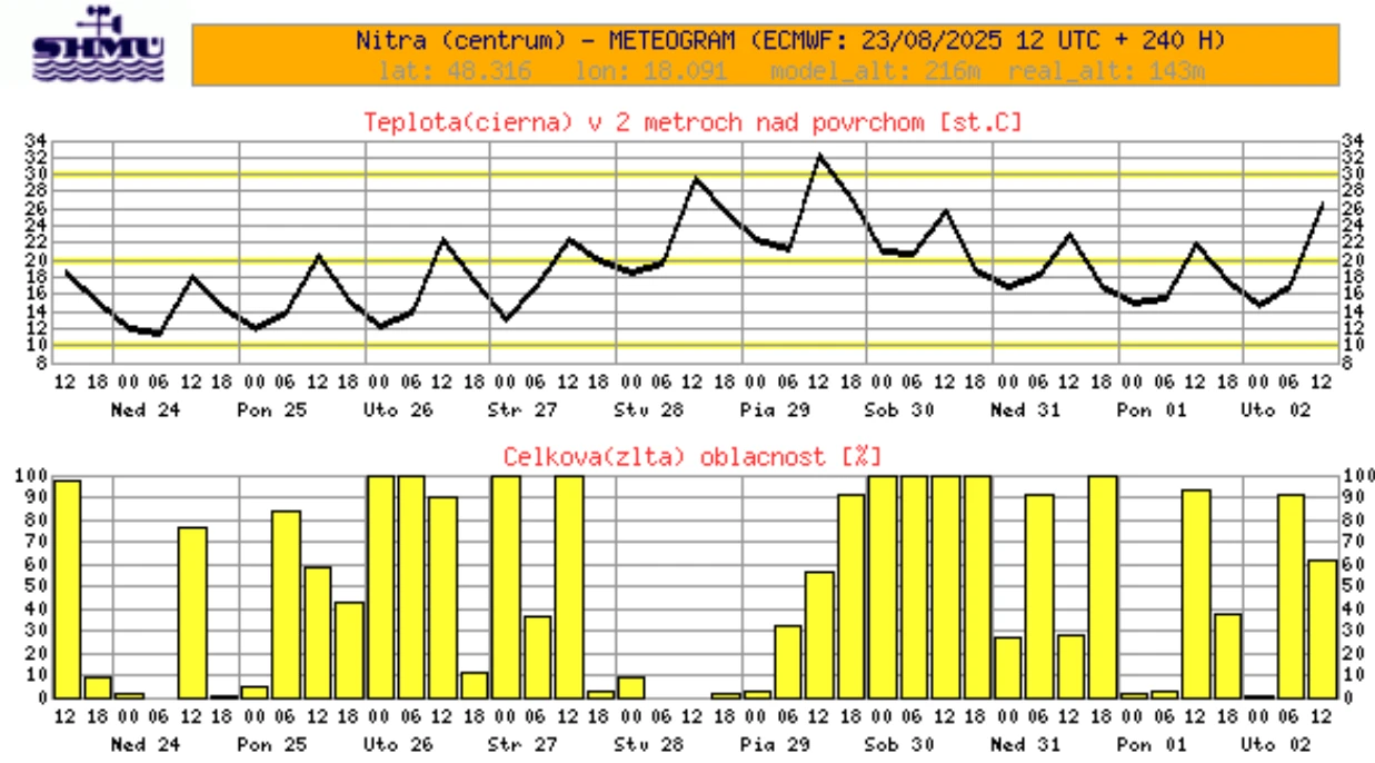 Zatiaľ čo začiatok týždňa ešte prinesie len mierne oteplenie, od utorka by sa maximálne denné teploty mali dostať nad 25 °C. Podľa meteogramu SHMÚ bude v Nitre a okolí najteplejší štvrtok a piatok, kedy teplota dosiahne viac ako 30 °C.