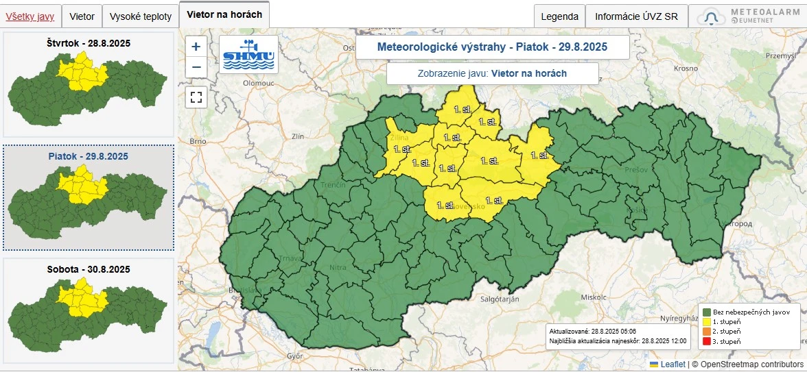 Pred nami je predĺžený víkend aj posledné tropické dni, ktoré však miestami ovplyvní silný vietor. Slovenský hydrometeorologický ústav (SHMÚ) vydal pre Nitriansky kraj výstrahy 1. stupňa pred vysokými teplotami, ktoré platia vo štvrtok a piatok. V ďalších okresoch sú však vyhlásené varovania pred vetrom či víchricou na horách. Ak ste chceli stráviť voľné dni turistikou v Tatrách, radšej zmeňte plány.