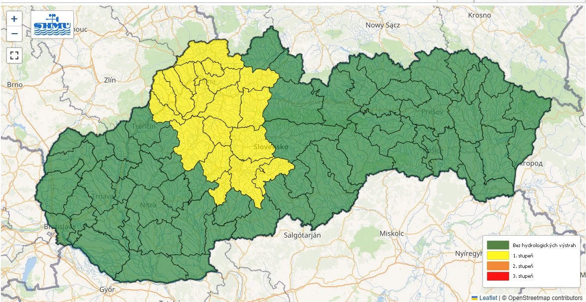 Hydrologické výstrahy 1. stupňa platia pre Horné a Stredné Považie, Liptov, Kysuce, Oravu a Hornú Nitru, ako aj povodie rieky Hron.