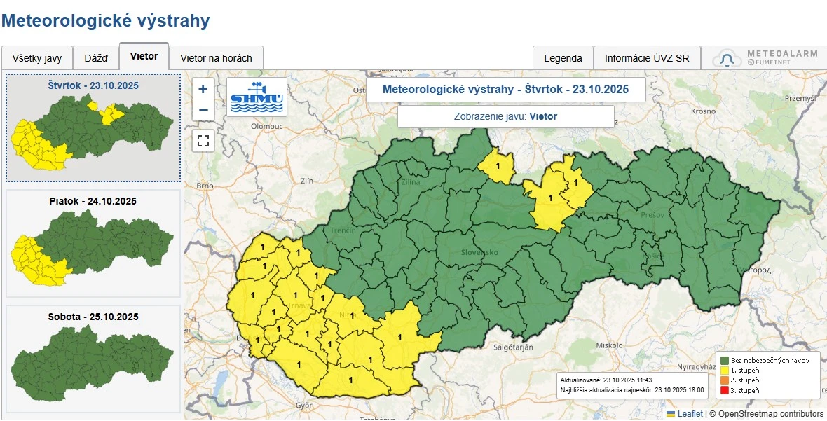 „V týchto okresoch sa očakáva výskyt vetra, ktorý dosiahne krátkodobo (v nárazoch) rýchlosť 18 - 21 m/s (65 - 75 km/h). Táto rýchlosť predstavuje potenciálne nebezpečenstvo pre ľudské aktivity. Predpokladaná rýchlosť vetra je v danej ročnej dobe a oblasti bežná, ale môže spôsobiť škody menšieho rozsahu,“ uvádzajú meteorológovia.
