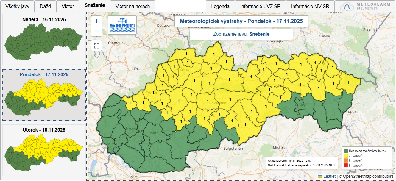 Sneženie sa môže v nasledujúcich dňoch prevažne na severe stredného a východného, ale aj v časti južného Slovenska. Na viacerých lokalitách má napadnúť do 5, niekde až 10 centimetrov snehovej pokrývky. Vyskytnúť sa môže v polohách vyšších ako 400 metrov nad morom.