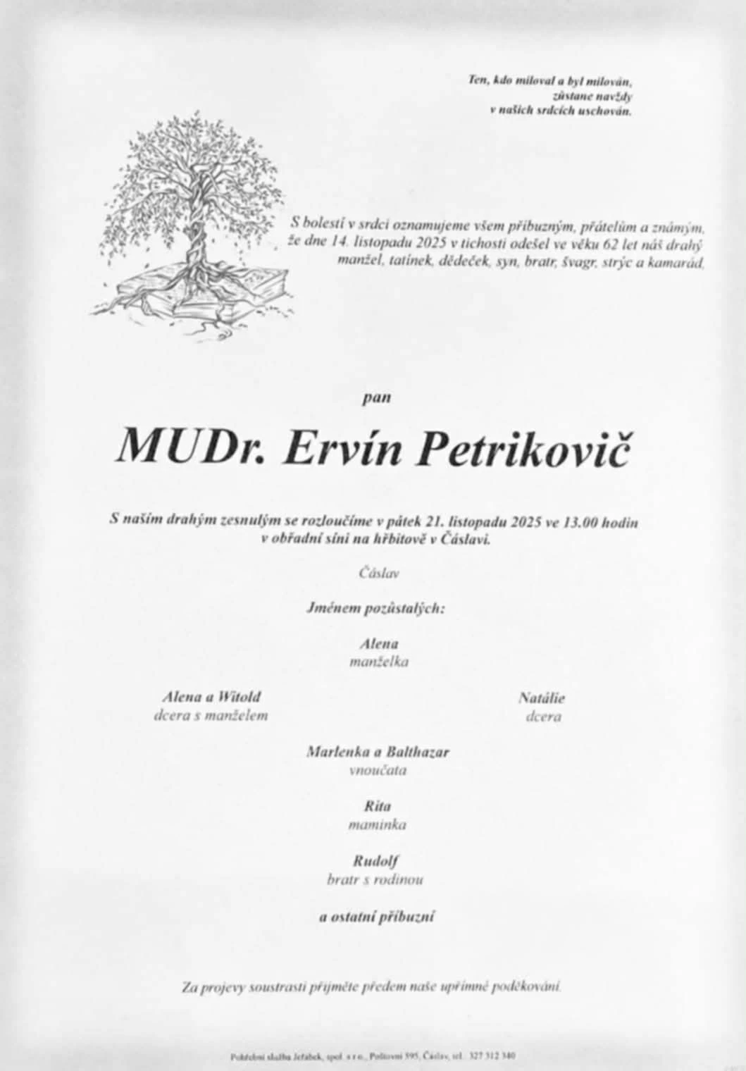 Posledná rozlúčka s Ervínom sa uskutoční v piatok 21. novembra 2025 o 13:00 hod. v obradnej sieni na cintoríne v Čáslavi.