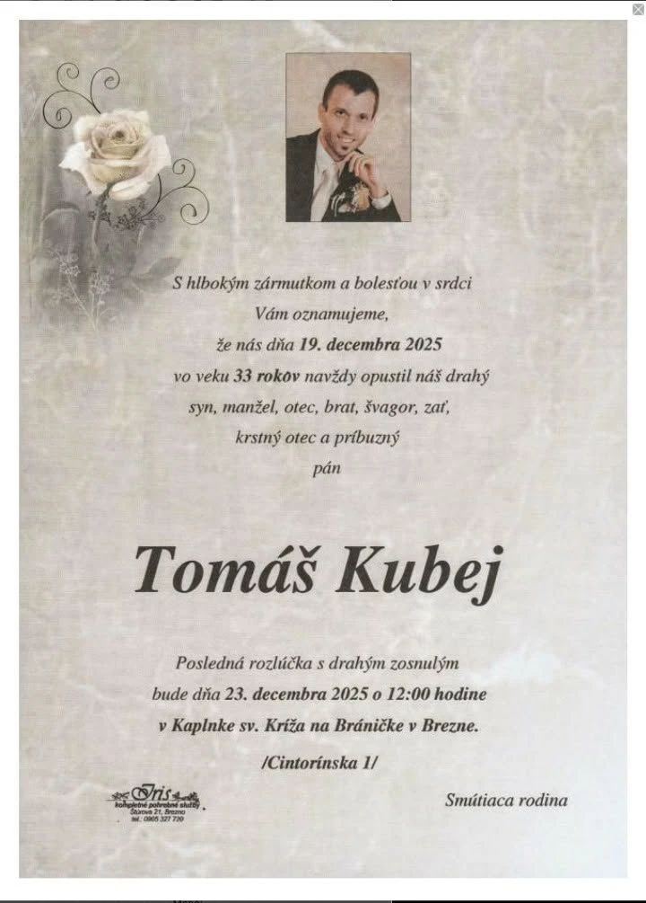 Posledná rozlúčka s Tomášom sa uskutoční 23. decembra o 12:00 hod. v Kaplnke sv. Kríža na Bráničke v Brezne.