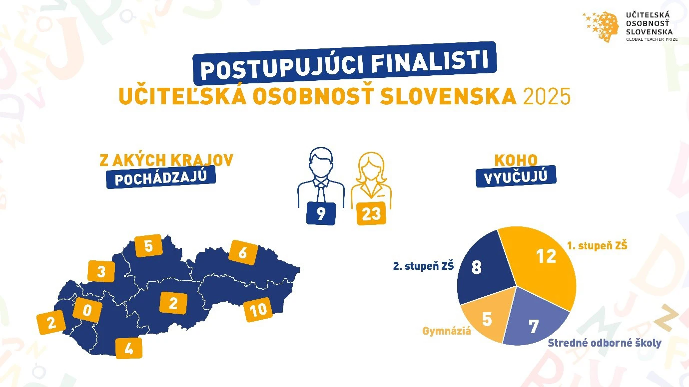 Medzi finalistami sú pedagógovia a pedagogičky z prvého aj druhého stupňa základných škôl, zo stredných škôl vrátane stredných odborných škôl. Výrazné zastúpenie pritom majú učitelia z Prešovského a Košického kraja, ktorí tvoria približne tretinu výberu. Medzi nominovanými sa však nestratil ani Nitriansky kraj – do TOP 32 sa dostali tri učiteľky a jeden učiteľ.