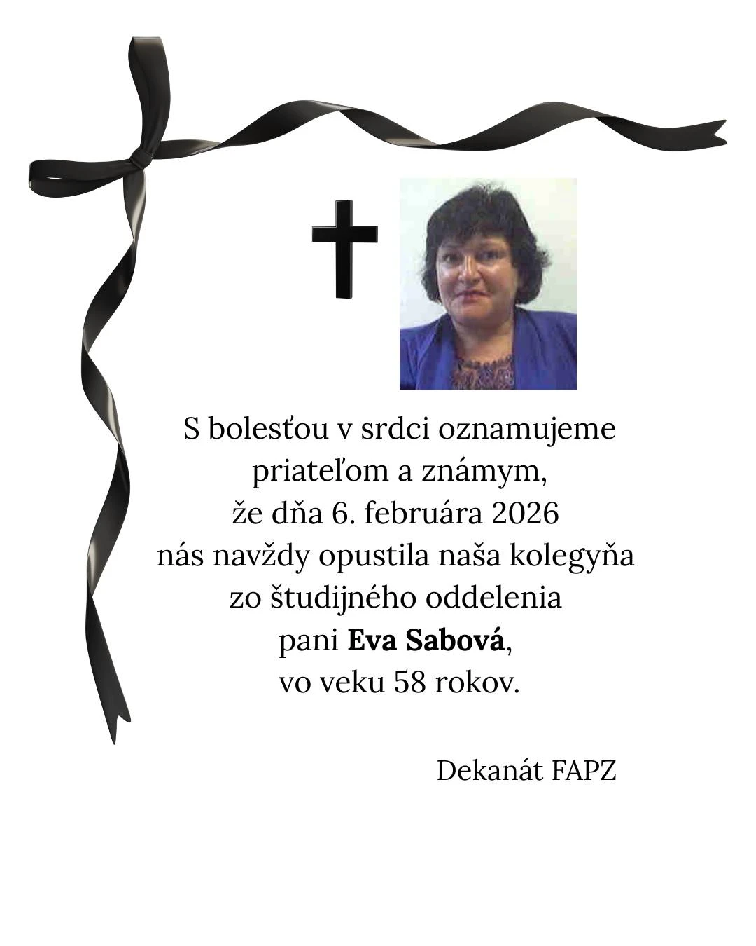 Slovenská poľnohospodárska univerzita (SPU) v Nitre pred pár dňami oznámila mimoriadne smutnú správu. V piatok 6. februára zomrela Eva Sabová (†58), dlhoročná kolegyňa a zamestnankyňa univerzity. Pôsobila na Fakulte agrobiológie a potravinových zdrojov, kde pracovala ako študijná referentka pre bakalárske štúdium. O jej úmrtí informoval dekanát FAPZ na sociálnej sieti.
