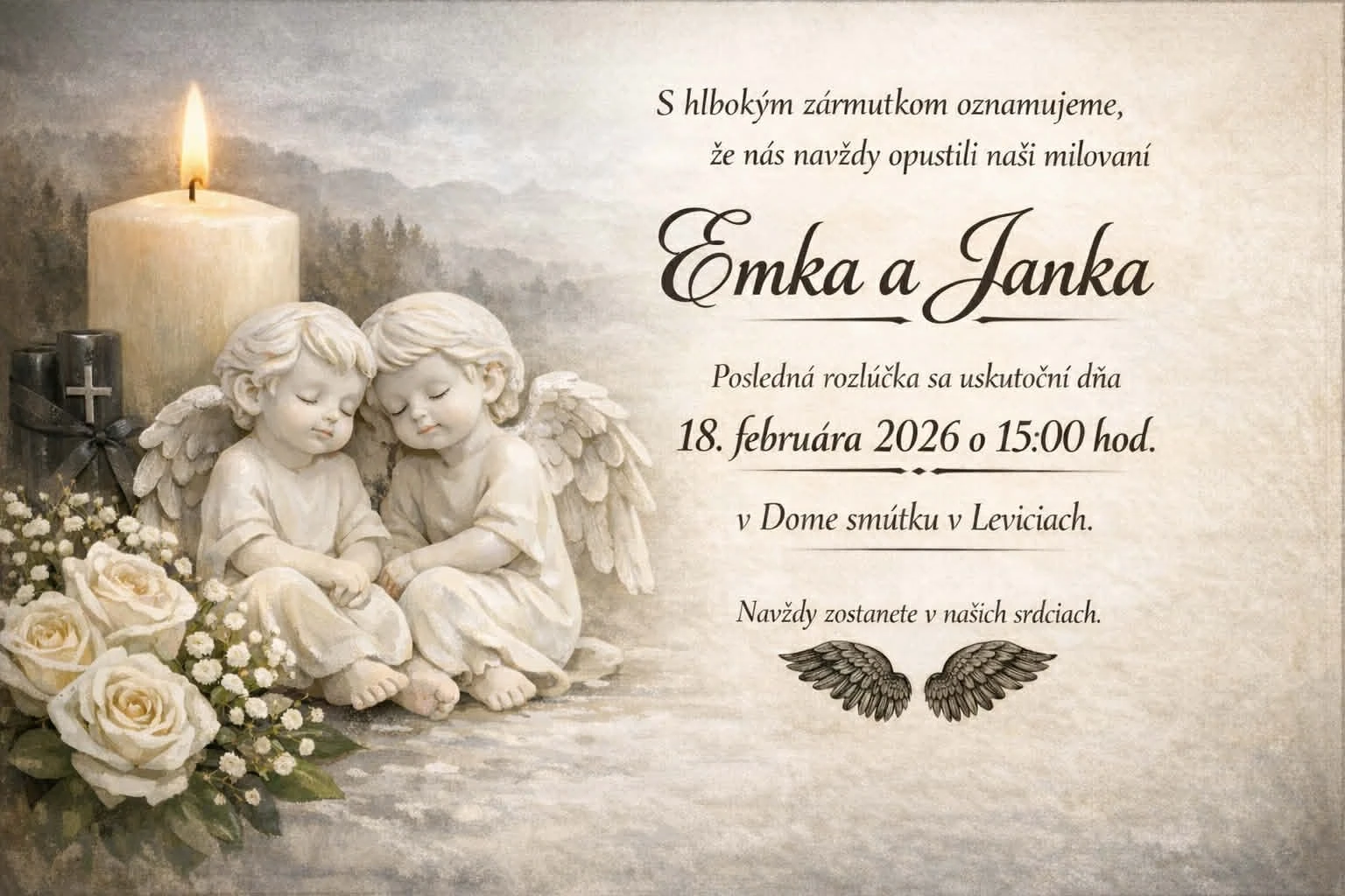 Pred domom, v ktorom došlo k tragédii, od minulého týždňa pribúdajú kvety, sviečky a detské hračky. Na budove Emkinej školy visí čierna vlajka. Posledná rozlúčka s Jankou a Emkou sa uskutoční v stredu 18. februára o 15:00 hod. v Dome smútku v Leviciach.