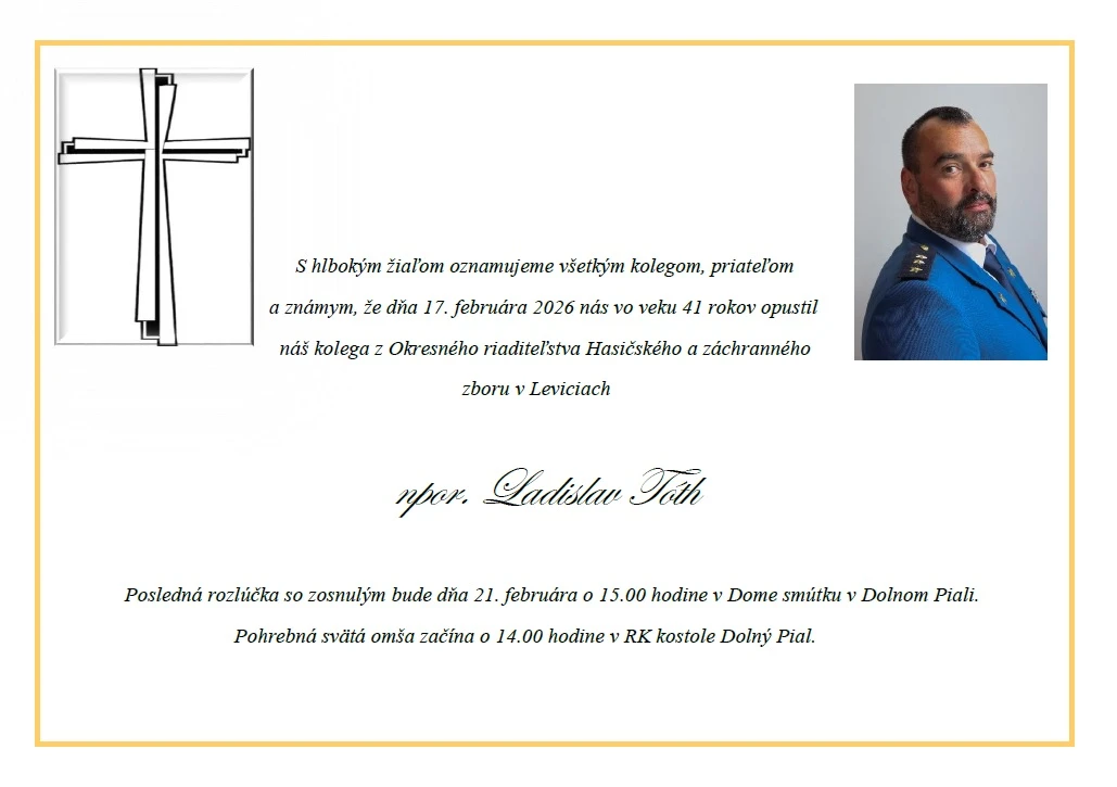 Hasičský a záchranný zbor v týchto dňoch zasiahla mimoriadne smutná správa o úmrtí jedného z dlhoročných kolegov. V utorok 17. februára zomrel vo veku 41 rokov nadporučík Ladislav Tóth, ktorý slúžil na Okresnom riaditeľstve Hasičského a záchranného zboru v Leviciach.