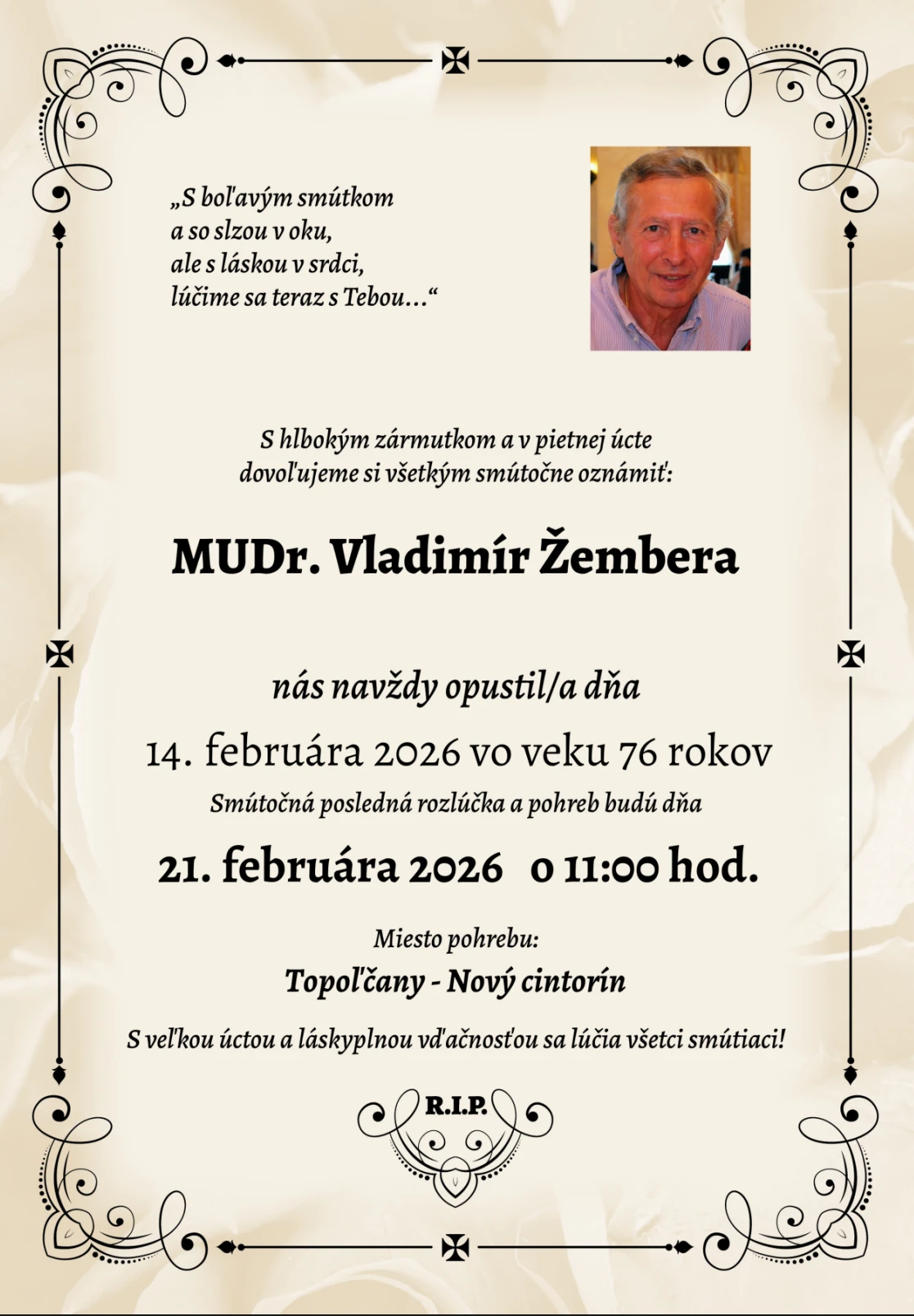 Vo veku 76 rokov zomrel na svätého Valentína internista a rešpektovaný lekár MUDr. Vladimír Žembera, ktorý dlhé roky pôsobil v Topoľčanoch. Posledná rozlúčka a pohreb sa uskutočnia v sobotu 21. februára o 11:00 hod. na miestnom cintoríne.