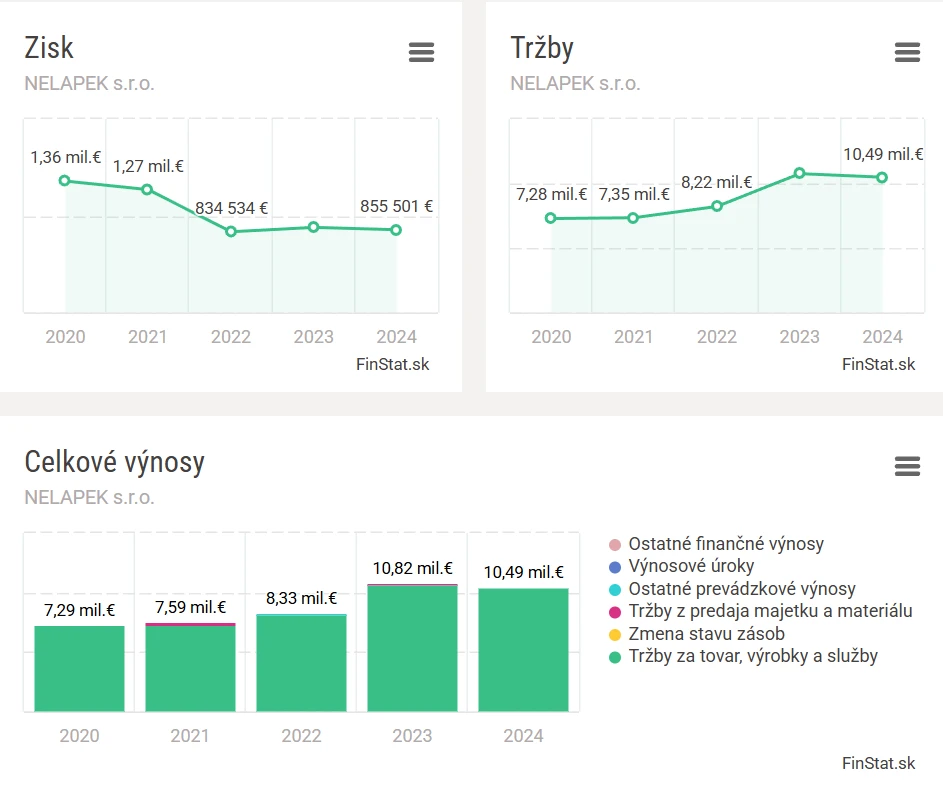 Spoločnosť Nelapek dosiahla v roku 2024 podľa databázy FinStat tržby vo výške približne 10,49 milióna eur a čistý zisk 855-tisíc eur. To z nej robí nadpriemerne ziskového hráča v segmente čerstvého pečiva, kde viaceré podniky bojujú s veľmi nízkymi maržami.